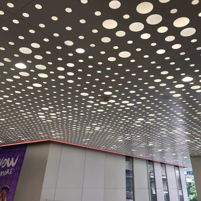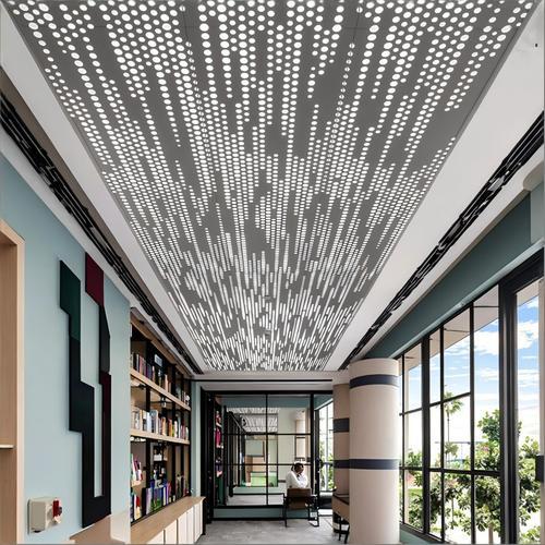 穿孔+背衬吸音棉。 在铝板上按一定穿孔率打出微孔(孔径1.0mm至3.0mm),板后铺设无纺布和玻璃棉或岩棉。声波通过穿孔进入棉层,在纤维间摩擦转化为热能。降噪系数(NRC)可达0.7至0.9,足以应对开放式办公室、餐厅、走廊等中高频噪音为主的场景。