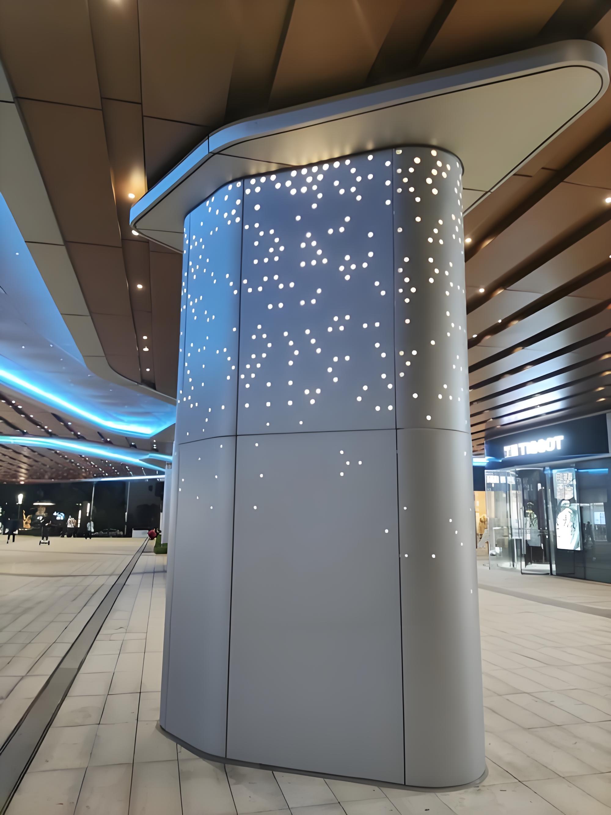 依托激光切割与数控折弯技术,板材可实现0.05mm级精度控制,支持圆形、方形、六角形等多元柱体造型,甚至打造双曲面、波浪纹等复杂几何形态13。特殊冲孔工艺可雕琢出渐变孔径或艺术图案,配合内嵌LED灯带,使立柱在昼夜呈现动态光影效果4。针对声学需求,可在板后加装吸音棉,实现隔音降噪功能一体化。