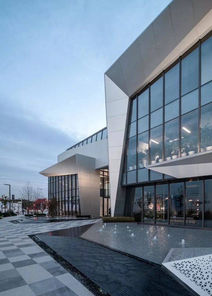 商业地标:广州某汽车4S店外立面使用双曲面铝单板,模拟流体动力学线条,白天呈现金属光泽变化,夜间借由内置灯带展现动态光效。